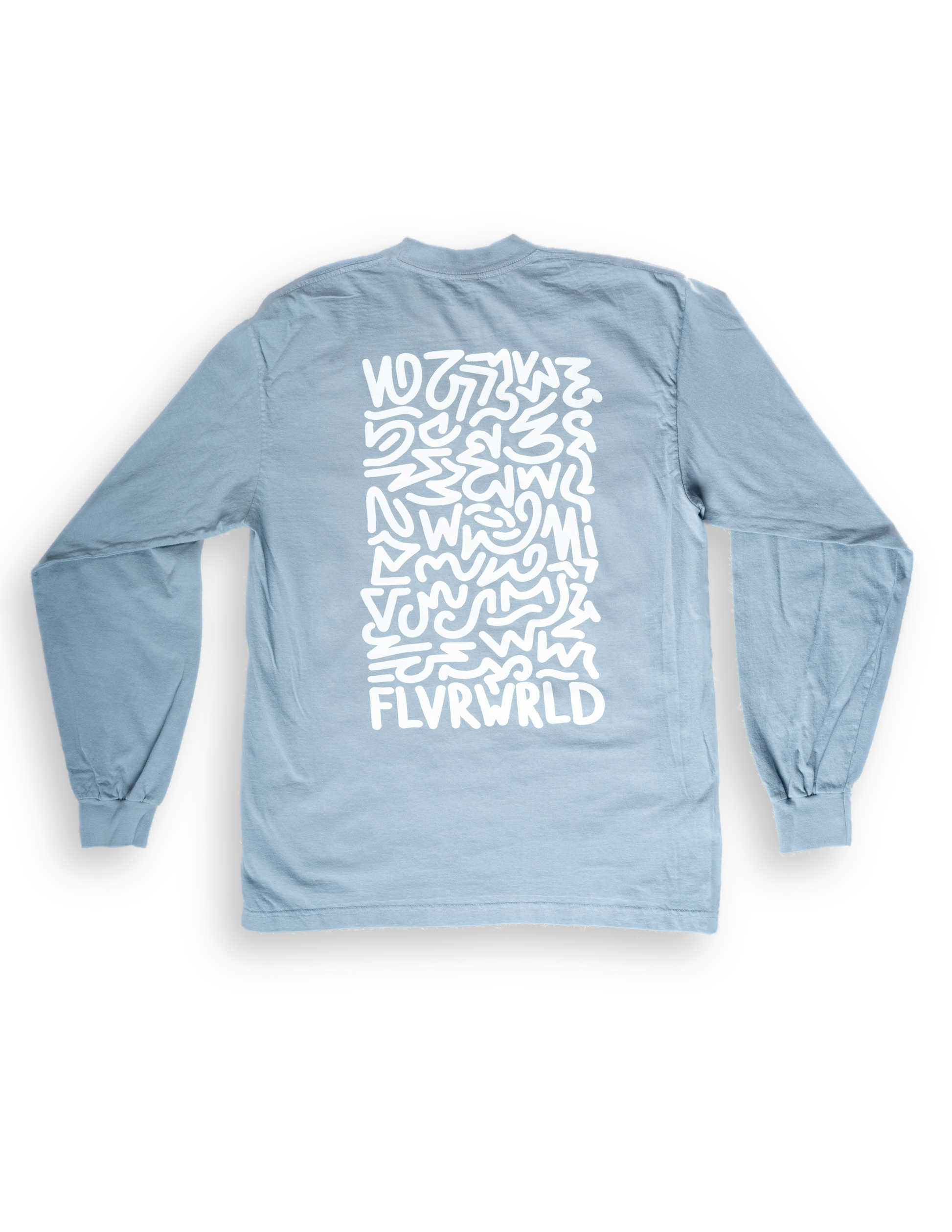 An ice blue long sleeve with the Flavor World signature "Fauxfiti" print on back.